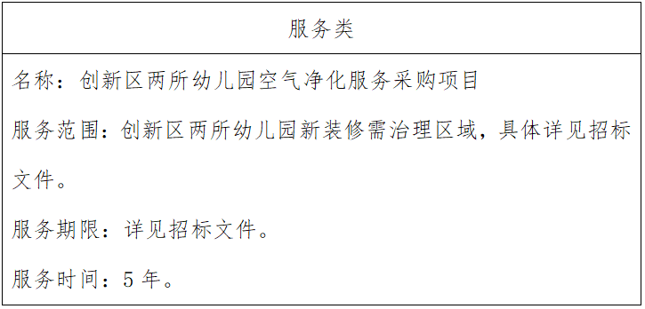 一、項(xiàng)目名稱創(chuàng)新區(qū)兩所幼兒園空氣凈化服務(wù)采購項(xiàng)目